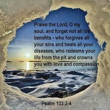 Bless the Lord, O my soul, and all that is within me, bless His holy name. Bless the Lord, O my soul, and forget not all His benefits, who forgives all your iniquities, who heals all your diseases, who redeems your life from the pit, who crowns you with lovingkindness and tender mercies, who satisfies your mouth with good things, so that your youth is renewed like the eagle’s. Psalm 103:1-5
