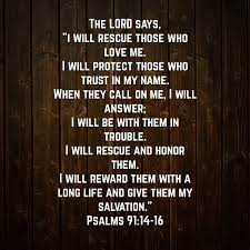 The Lord says, “I will rescue those who love me. I will protect those who trust in my name. When they call on me, I will answer; I will be with them in trouble. I will rescue and honor them. I will reward them with a long life and give them my salvation.” Psalms 91:14-16 NLT