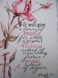 To give them beauty for ashes, The oil of joy for mourning, The garment of praise for the spirit of heaviness; That they may be called trees of righteousness,The planting of the Lord, that He may be glorified. Isaiah 61:3 NKJV